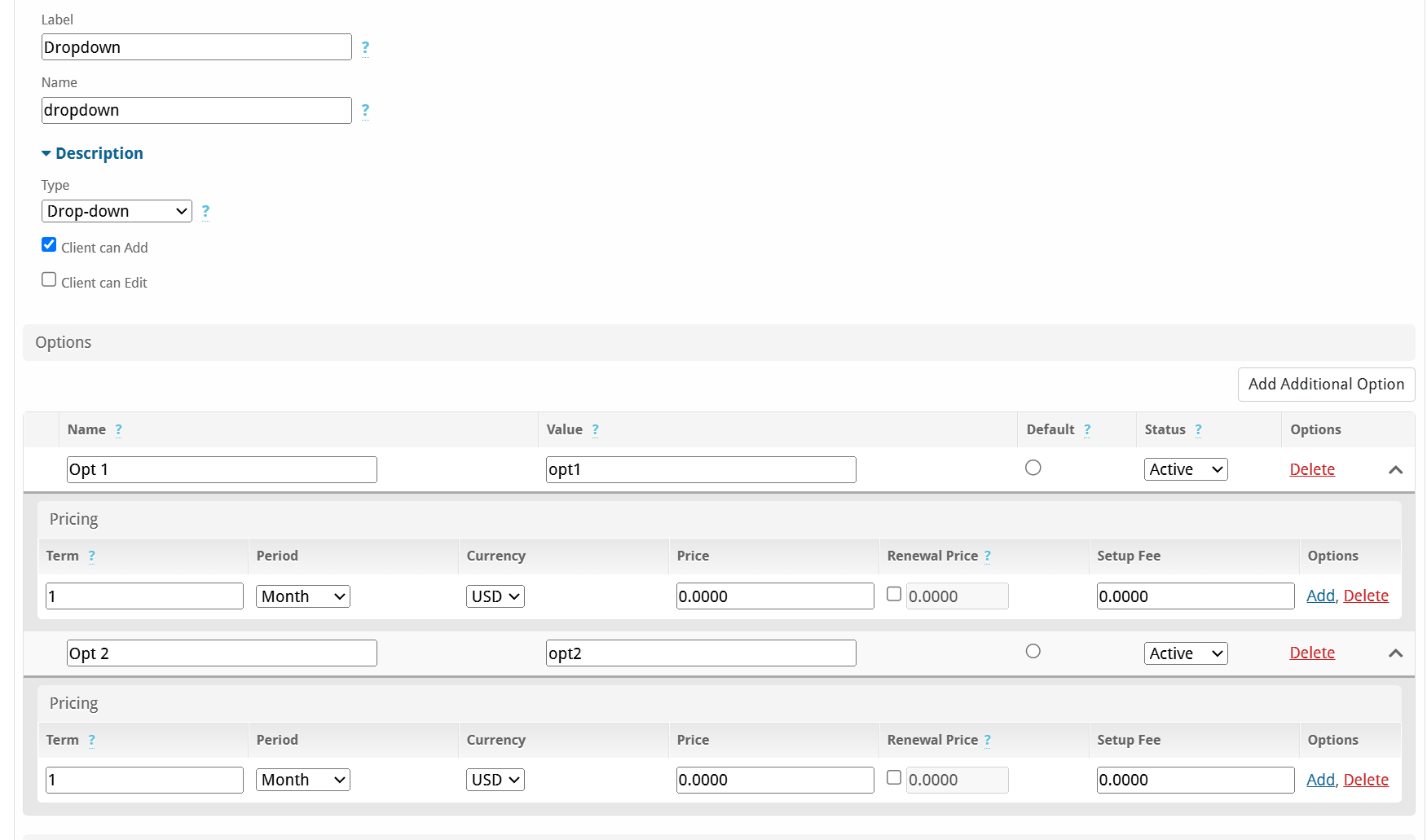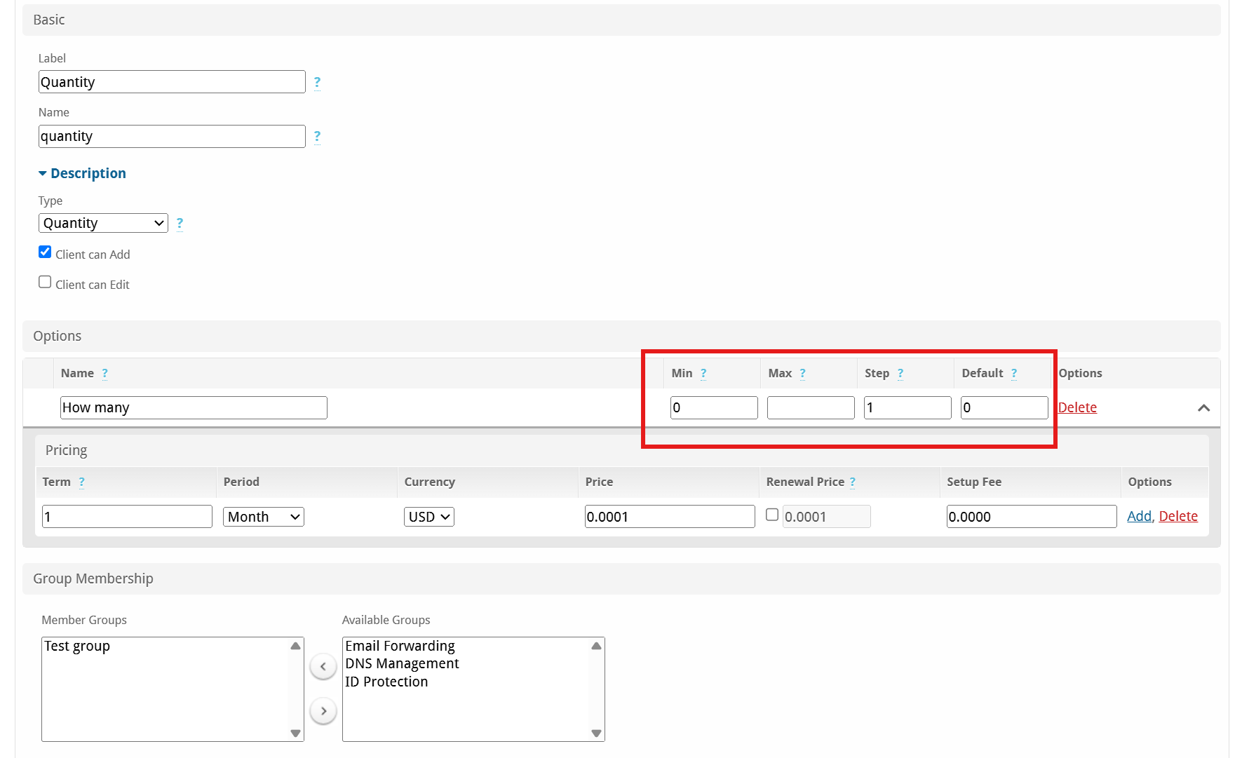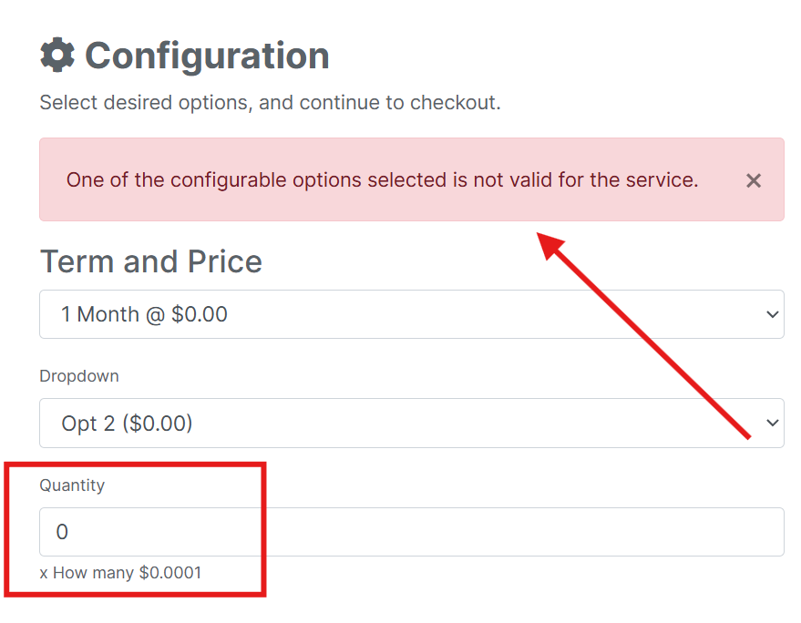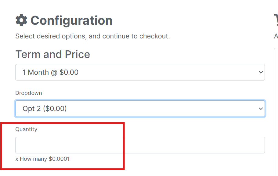 Quantity config option with a default of 0 appears blank initially